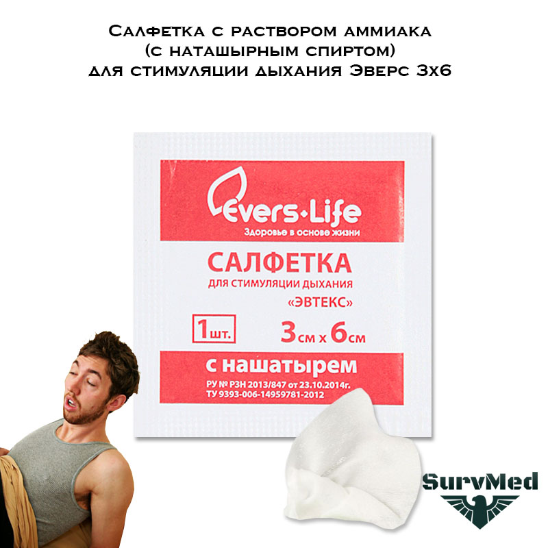 Салфетка с раствором аммиака Эверс 3х6 - это салфетка с наташырным спиртом для стимуляции дыхания при обморочных состояниях.