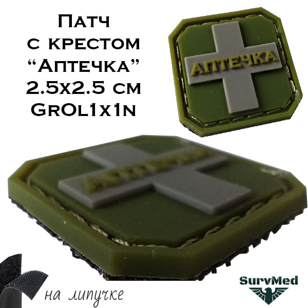 Патч с крестом Аптечка GrOl1x1n - это прорезиненный шеврон ПВХ на липучке, серый крест на оливковом фоне в виде мини версии 2.5x2.5см.