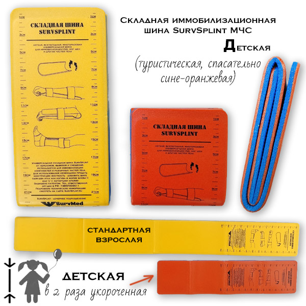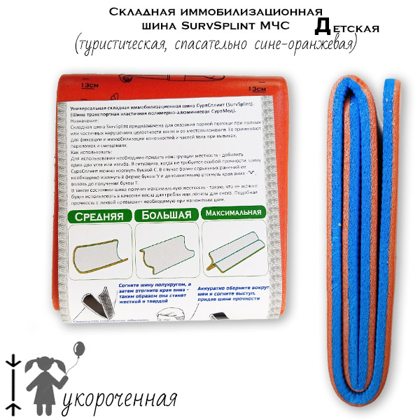 SurvSplint Д — это детская укороченная складная шина от переломов, вывихов и смещений. Гражданская версия сигнального ярко-оранжевого с синим аварийного цвета повышенной заметности.