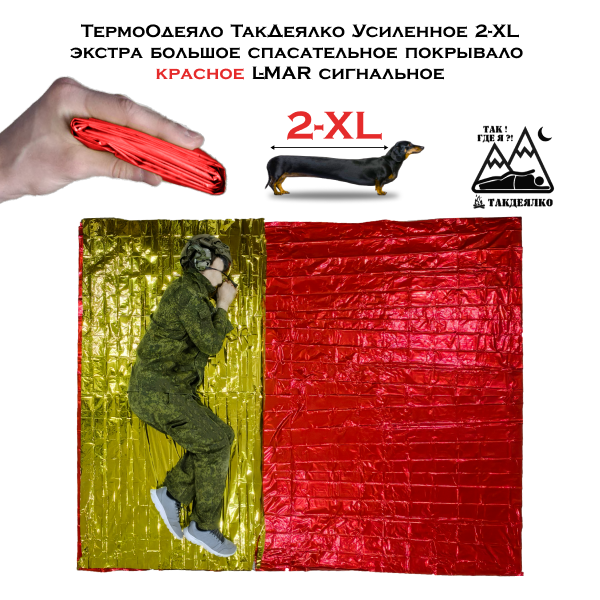 Спасательное покрывало ТакДеялко 2-XL Усиленное (красное ТермоОдеяло L-MAR) - это экстра большое теплоотражающее ультратонкое и ультралегкое пленочное одеяло, которое отражает тепло тела обратно. Оно помогает снизить потери тепла в ситуациях, когда возможна гипотермия (переохлаждение).