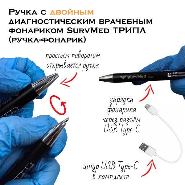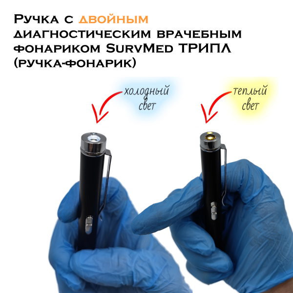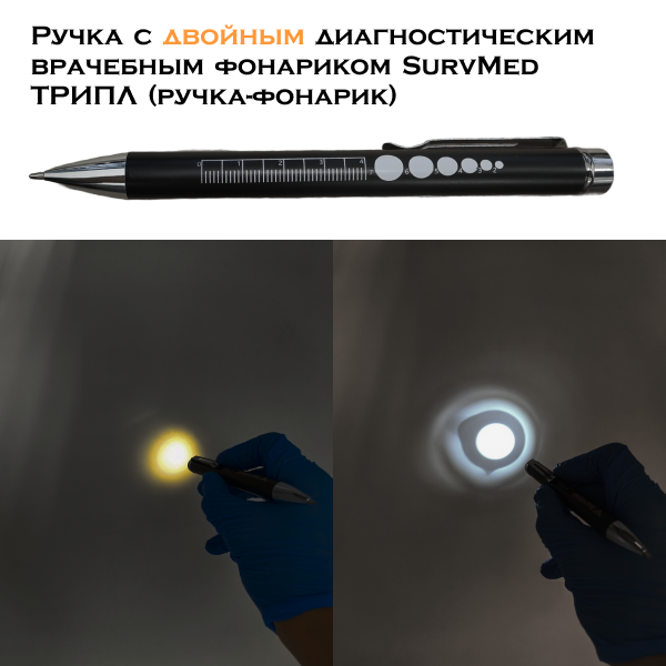 Ручка с двойным диагностическим врачебным фонариком SurvMed ТРИПЛ (ручка-фонарик) - это компактный фонарик в корпусе пищущей авторучки для проведения медицинских осмотров. С его помощью можно проводить первичный визуальный осмотр слизистых носоглотки, гортани, наружного слухового прохода, кожного покрова, рта, и др и тут же записывать результаты на бумаге.