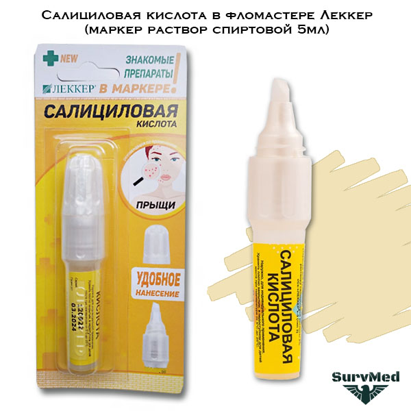 Салициловая кислота в фломастере Леккер - это маркер со спиртовым раствором 2% салициловой кислоты 5мл для дезинфекции кожи от прыщей, угрей, экземы и мозолей.
