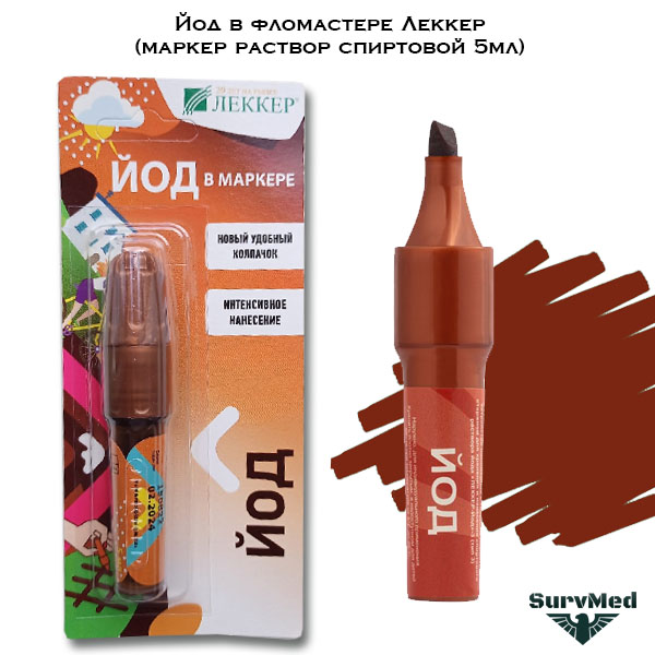 Йод в фломастере Леккер - это фломастер (маркер) со спиртовым раствором йода 5мл для дезинфекции кожи.