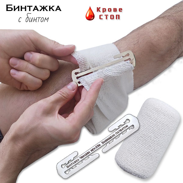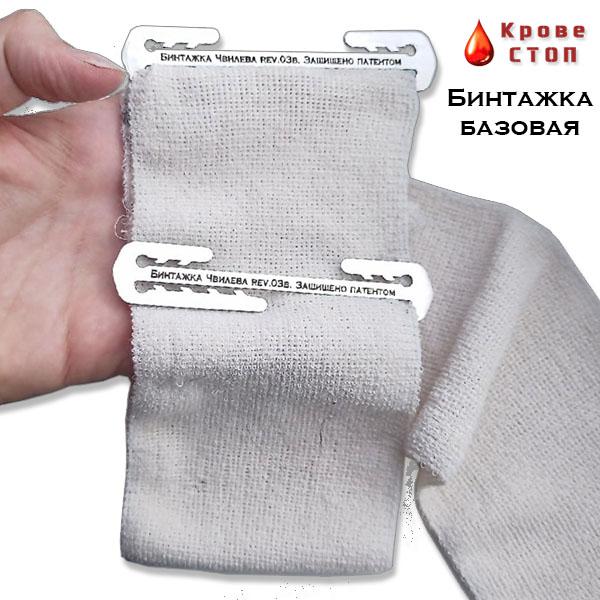 Бинтажка Базовая Кровестоп с эластичным бинтом — это стопор-фиксатор на эластичном бинте, позволяющий замыкать свободный конец сам на себя.