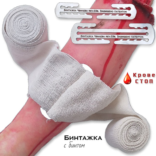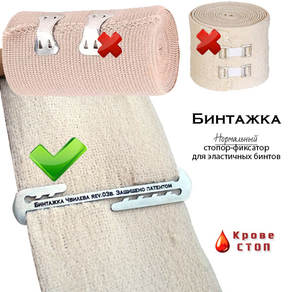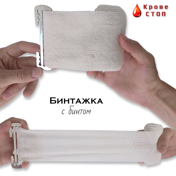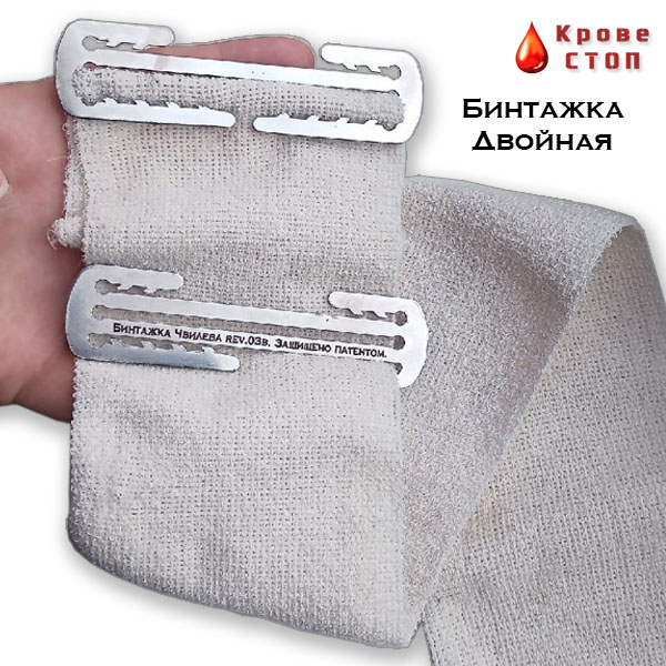 Бинтажка Двойная Кровестоп с эластичным бинтом — это стопор-фиксатор на эластичном бинте, позволяющий замыкать свободный конец сам на себя.