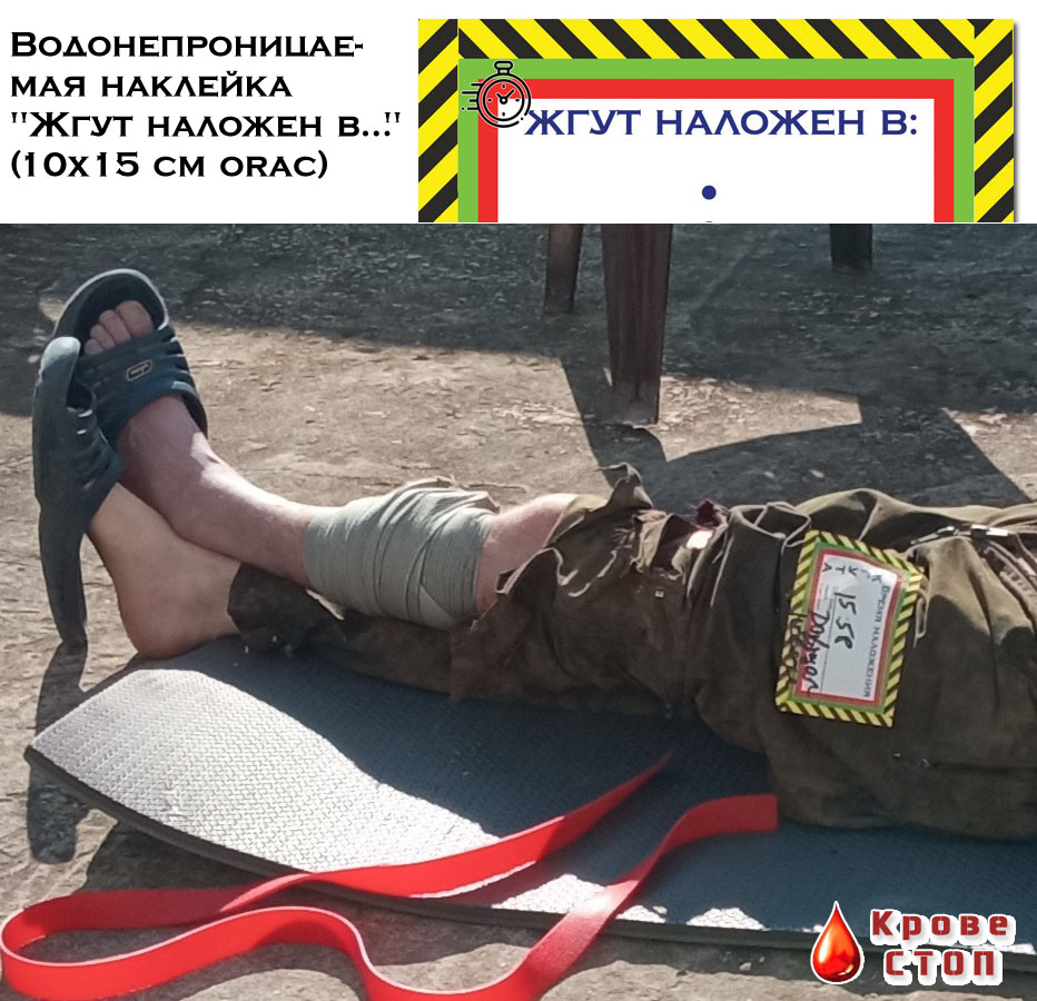 Исполнение наклейки сделано в ярких цветах максимальной заметности, чтобы медик, принимающий пострадавшего на следующем этапе эвакуации, не упустил указанную информацию и ТОЧНО заметил наложенный жгут, который может быть не видно под складками одежды или следами грязи и крови.