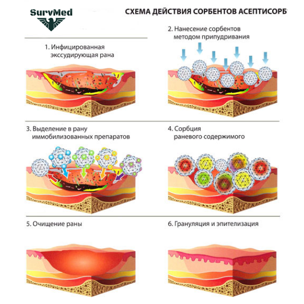 Сорбенты нужно применять на мокрых ранах (из которых течет кровь, либо выступает лимфа). После попадания в рану порошок сорбента гранулируется (превращается в крупнозернистый гель), тем самым уменьшая кровотечение и останавливая инфицирование.