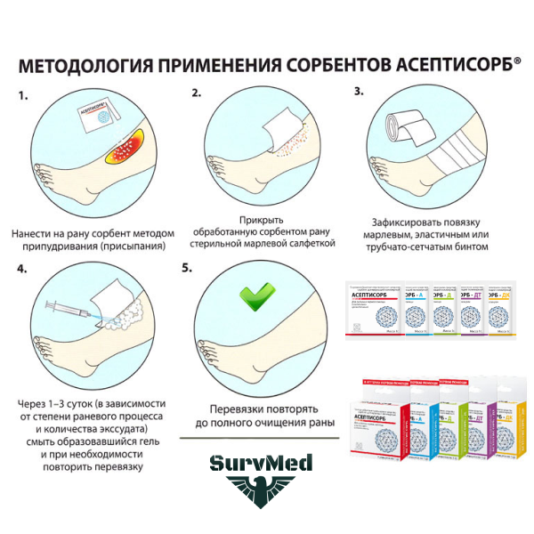 Сорбенты нужно применять на мокрых ранах (из которых течет кровь, либо выступает лимфа). После попадания в рану порошок сорбента гранулируется (превращается в крупнозернистый гель), тем самым уменьшая кровотечение и останавливая инфицирование.