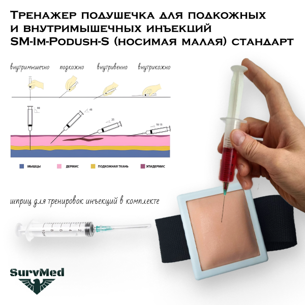 Тренажер подушечка для п\к и в\м инъекций SM-Im-Podush-S предназначен для отработки уколов под кожу и внутримышечно, введения лекарственных или обезболивающих средств. С его помощью можно практиковать инъекции в мышцу или тренировать уколы под кожу.