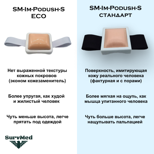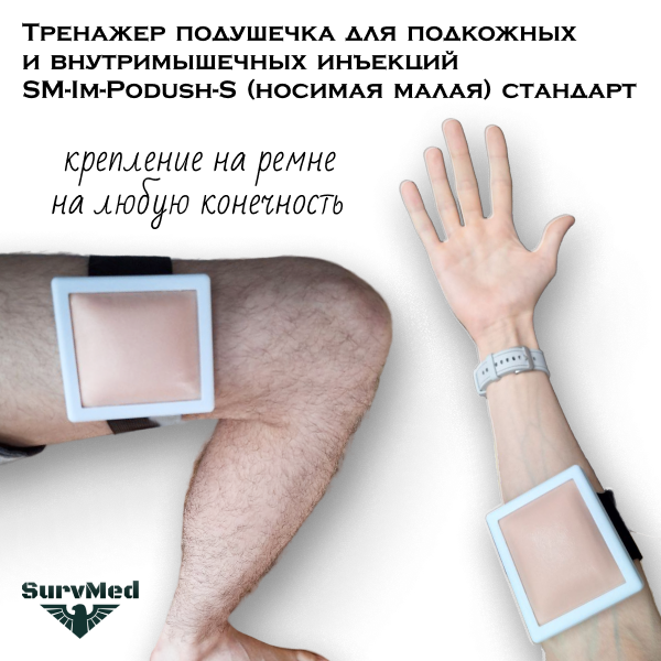 Инъекционный тренажер Сурвмед Im-Podush-S представляет из себя мягкую подушечку в жесткой пластиковой рамке на ремне. Тренажер подходит как для настольного расположения (на жесткой поверхности), так и для носимого на теле человека применения - его можно крепить с помощью ремешка-крепления на руку или на ногу.
