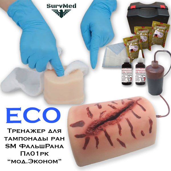 Тренажер для тампонады SM ФальшРана ECO Пл01рк - это симуляционный набор из плоской имитации части тела с узкой и длинной (отверстие) раной.