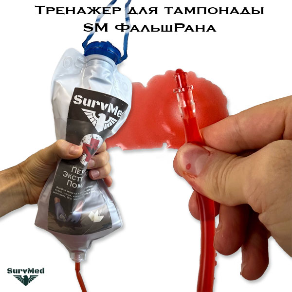 Тренажер для тампонады "СурвМед ФальшРана" оснащен двумя емкостями для иск.крови: жесткая (бутылочка) и мягкая (инфузионный пакет). Благодаря им, можно имитировать кровотечение различной силы тяжести: подвешивать их выше ранения, чтобы "кровь" стекала самотёком под действием силы тяжести (слабый напор), сдавливать стенки, чтобы кровь хлестала под давлением (постоянный сильный напор или рывками), чередовать с воздухом (средний напор с пузырями воздуха, имитируя пневмоторакс) и так далее.