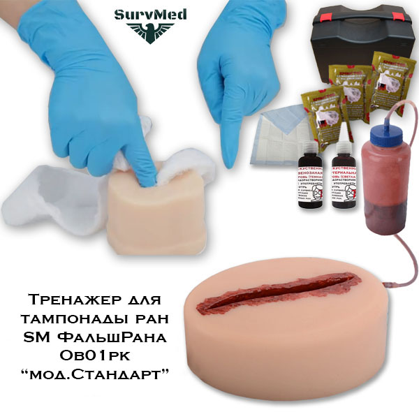 Тренажер SM ФальшРана предназначен для тренировки первой помощи и наработки навыка тампонады ран. Он позволяет отработать моторику рук по остановке кровотечения в ране путем введения в имитацию раны марлевых или гемостатических бинтов, тампонов, турунд и иных средств остановки кровотечения, позволяющих создать давление на поврежденный сосуд.