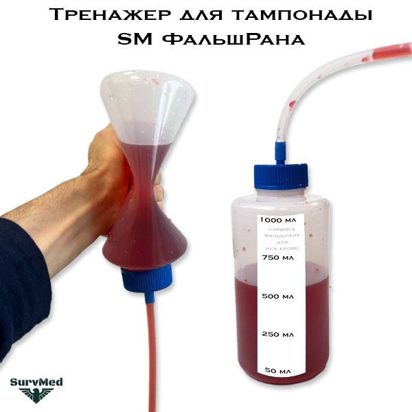 Тренажер для тампонады "СурвМед ФальшРана" оснащен двумя емкостями для иск.крови: жесткая (бутылочка) и мягкая (инфузионный пакет). Благодаря им, можно имитировать кровотечение различной силы тяжести: подвешивать их выше ранения, чтобы "кровь" стекала самотёком под действием силы тяжести (слабый напор), сдавливать стенки, чтобы кровь хлестала под давлением (постоянный сильный напор или рывками), чередовать с воздухом (средний напор с пузырями воздуха, имитируя пневмоторакс) и так далее.