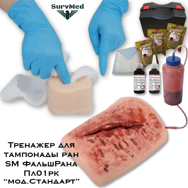Тренажер SM ФальшРана предназначен для тренировки первой помощи и наработки навыка тампонады ран. Он позволяет отработать моторику рук по остановке кровотечения в ране путем введения в имитацию раны марлевых или гемостатических бинтов, тампонов, турунд и иных средств остановки кровотечения, позволяющих создать давление на поврежденный сосуд.