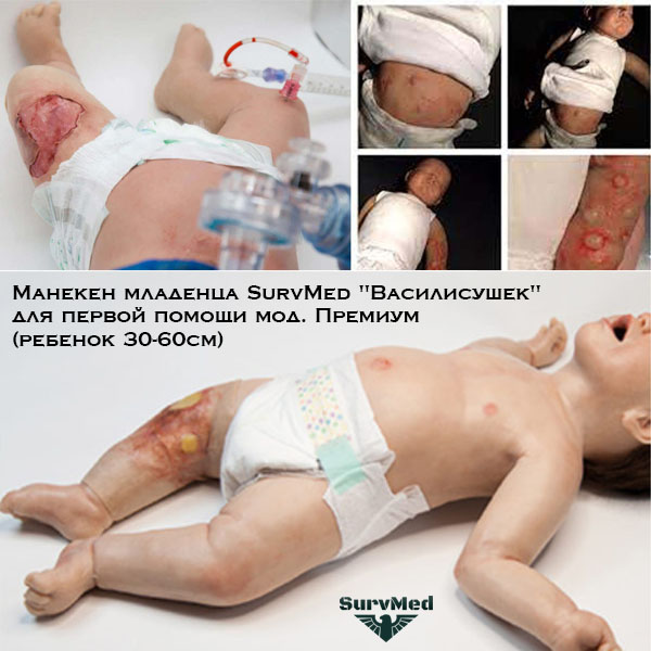 Манекен "Василисушек" - это манекен младенца (малолетнего ребенка) для отработки первой помощи при внешних травмах различного характера (ожоги, кровотечения, переломы и т.п.). С его помощью можно отрабатывать наложение противоожоговых повязок, десмургию (наложение повязок), купирование пневмоторакса и прочие подобные вещи.
