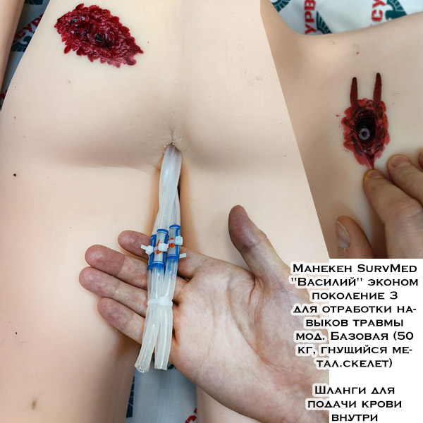 - Встроенне шланги для имитации кровотечения. Манекен можно подключить к системе подачи иск.крови, от специальных нагнетателей или ускорителей иск.крови (запрашивайте у менеджеров) и вплоть до обычных бутылок или пакетов с жидкостью.