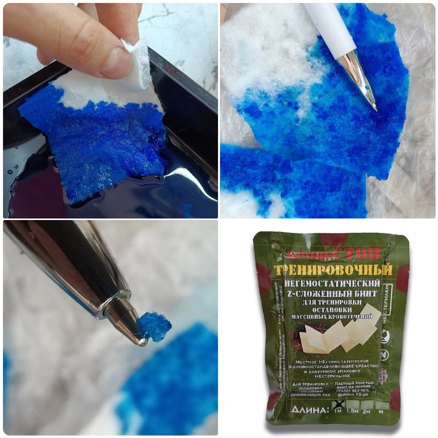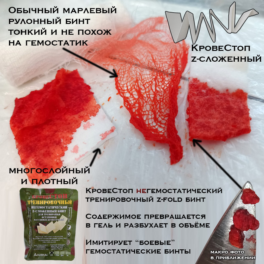 Защита от дурака: не упаковке специально в куче мест большими буквами написано ТРЕНИРОВОЧНЫЙ, чтобы мошенники не смогли продать это как “боевой” гемостатик. Не является кровоостанавливающим средством, не является мед.изделием.