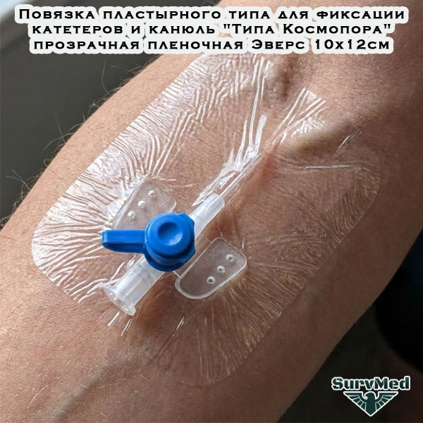 Фиксирующий пластырь для катетеров Эверс "Типа Космопора Транспарент" - это специальная самоклеящаяся гипоаллергенная повязка на рану из прозрачной плёнки для фиксации канюль.