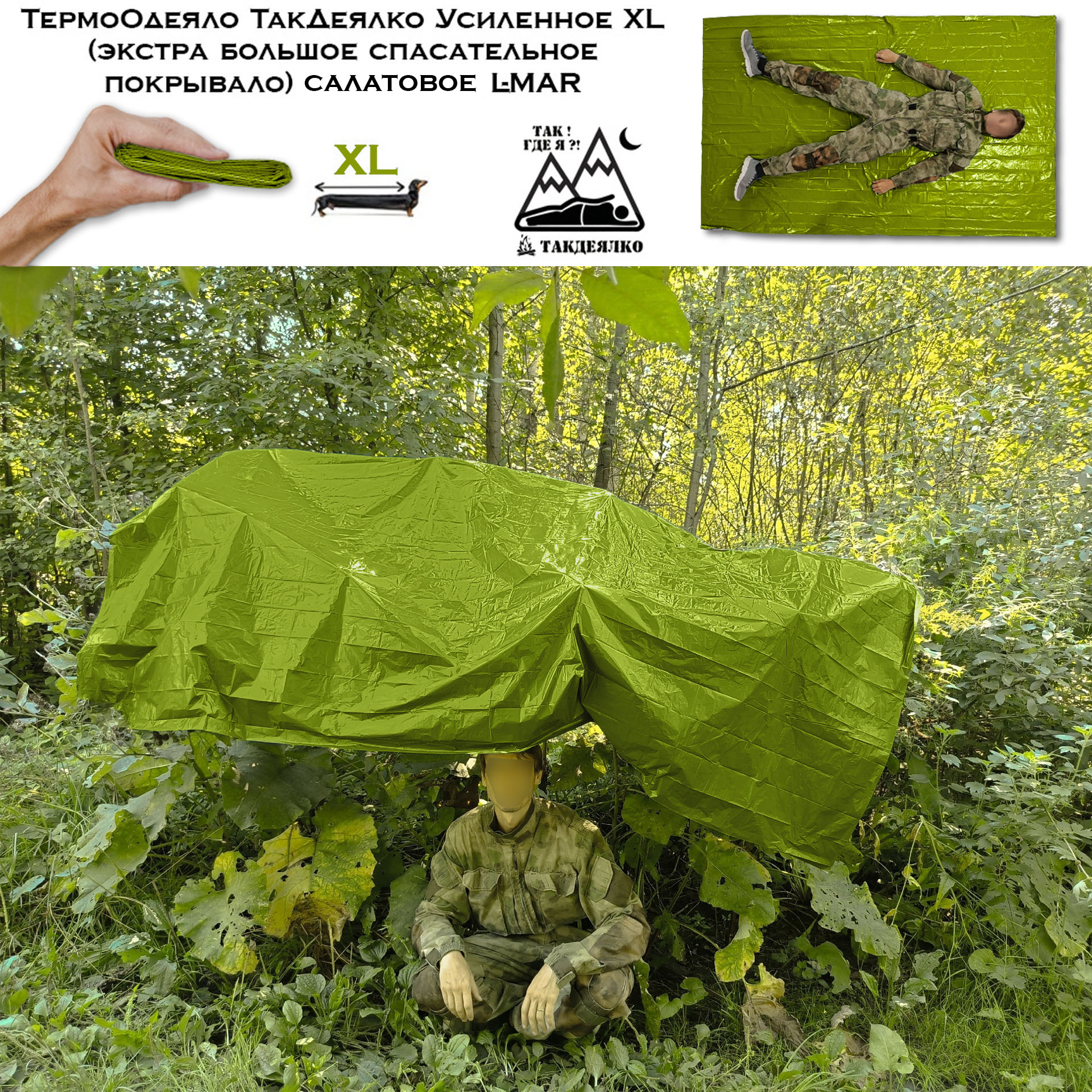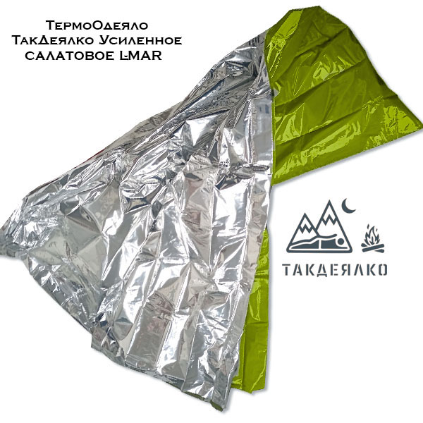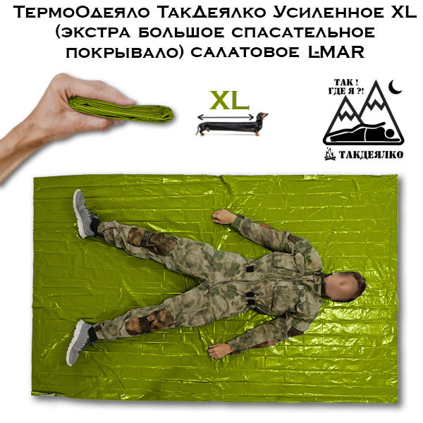 Спасательное покрывало ТакДеялко Усиленное 1.5 XL (Салатовое ТермоОдеяло L-MAR) - это экстра большое теплоотражающее ультратонкое и ультралегкое пленочное одеяло, которое отражает тепло тела обратно. Оно помогает снизить потери тепла в ситуациях, когда возможна гипотермия (переохлаждение).