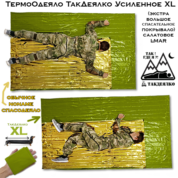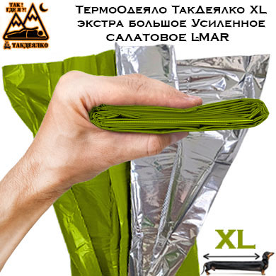 Спасательное покрывало ТакДеялко Усиленное 1.5 XL (Салатовое ТермоОдеяло L-MAR) - это экстра большое теплоотражающее одеяло для первой помощи с оливковым внешним слоем.
