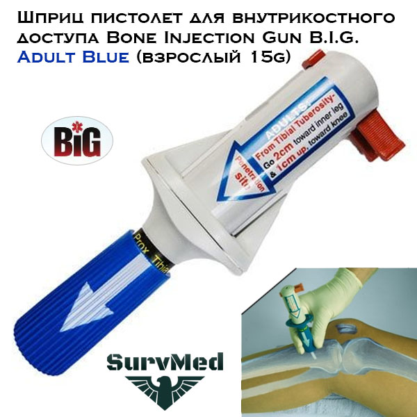 Шприц пистолет B.I.G. используется в экстренных ситуациях в качестве инструмента для внутрикостного доступа (для осуществления внутрикостной инфузии). Он применяется при серьезных повреждениях, когда произошла большая кровопотеря либо необходимо срочное восполнение жидкостей организма инфузионной терапией.