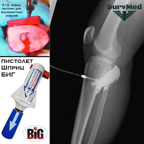 Шприц-пистолет B.I.G. также применяют при болевом, геморрагическом или анафилактическом шоке, либо для проведении неотложной анестезии или иных схожих действий, требующих быстрого внутрисосудистого доступа через костный мозг (костную ткань).