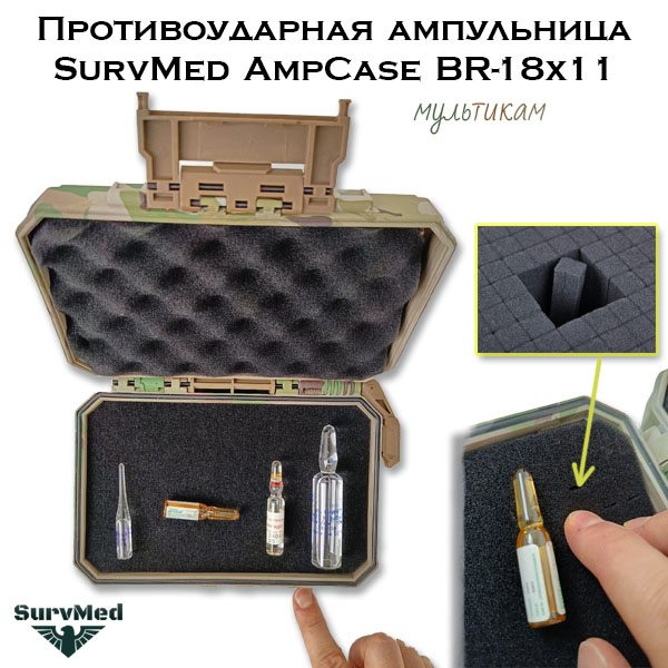 Противоударная ампульница SurvMed AmpCase BR-18x11 представляет собой защитный пластиковый кейс с мягким ложементом внутри. Конструкция кейса позволяет предотвратить бой ампул при падениях, ударах и МВТ.