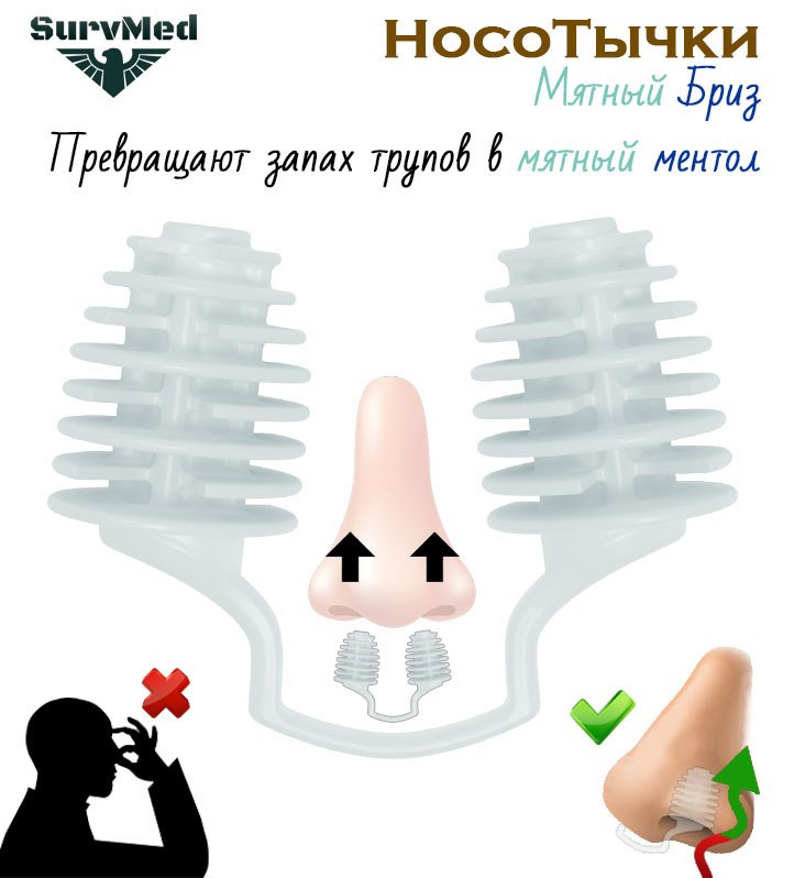 Затычки для носа НосоТычки предназначены для трансформации неприятных или невыносимых запахов в выносимые для дыхания на ограниченный период времени. Они помогут справиться с трупным запахом на месте расследования, ароматами пропотевшего и обоссанного бомжа, вонью скопившего мусора в накрытом притоне.