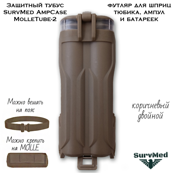 Защитный тубус SurvMed AmpCase MolleTube-2 (коричневый) - это двойной ударопрочный футляр для шприц тюбика, ампул и батареек с креплением на молле или ремень.