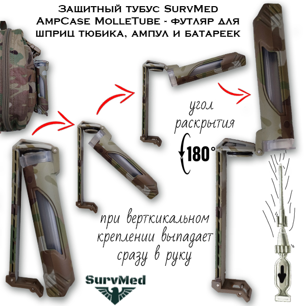Ударопрочный кейс SurvMed AmpCase MolleTube выполнен в форме вертикальной колбы-футляра, которую можно крепить на поясной ремень или экипровку, в слоты molle. Колба оснащена системой быстрого открытия: достаточно подцепить застёжку снизу и потянуть тубус на себя. При этом, возможность случайного раскрытия сведена к минимуму: даже если вы случайно отстегнули крепление, во время, скажем, переползания, футляр останется на месте и автоматически защелкнется обратно под действием давления.