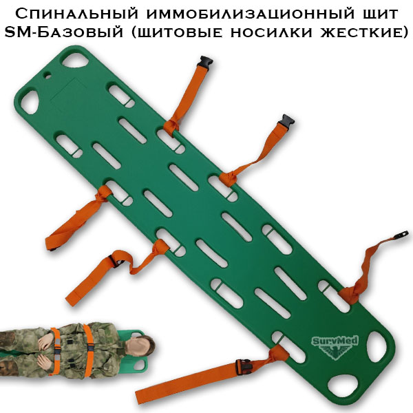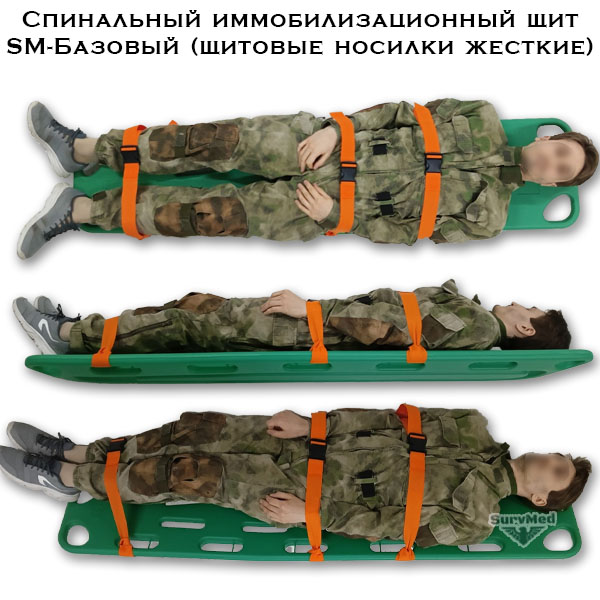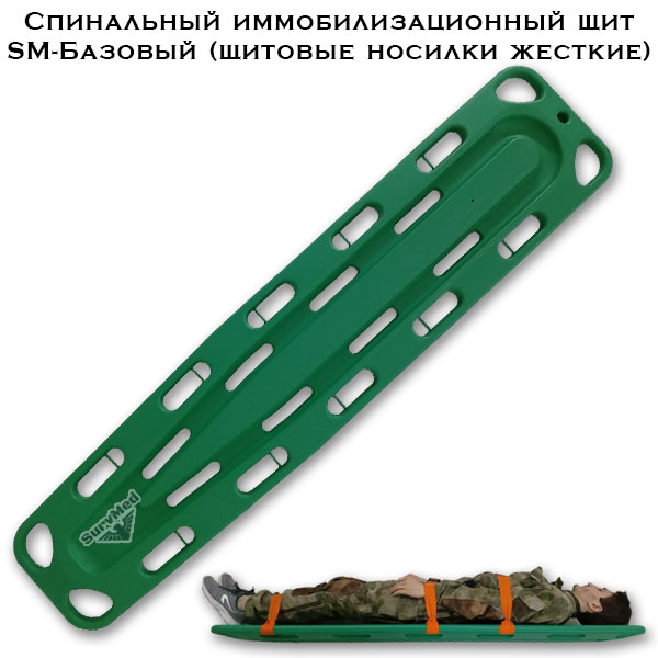 Спинальный иммобилизационный щит SM-Базовый предназначен для переноски и транспортировки пострадавших с травмами шейного, спинного и тазового отдела, а также травмах позвоночника. С его помощью раненого можно перенести на жесткой ровной поверхности, не меняя форму его тела и не позволяя голове\спине двигаться и изгибаться, что может ухудшить состояние больного.