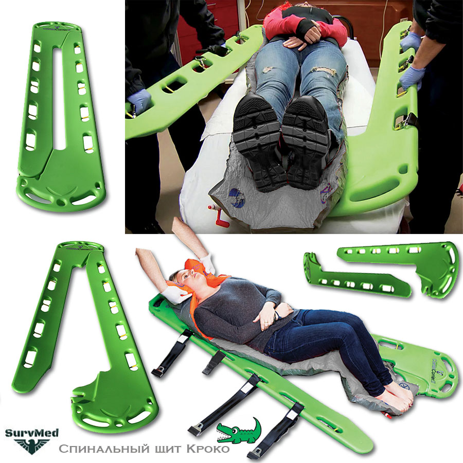 Щит для иммобилизации SM-Кроко может применяться как самостоятельное изделие, так и в комплекте с другим мед.оборудованием. Например, его можно перевозить на каталке и медицинских носилках скорой помощи или использовать вместе с шинами для иммобилизации конечностей, с шейным воротником, с вакуумными матрасами и иными средствами спасения.