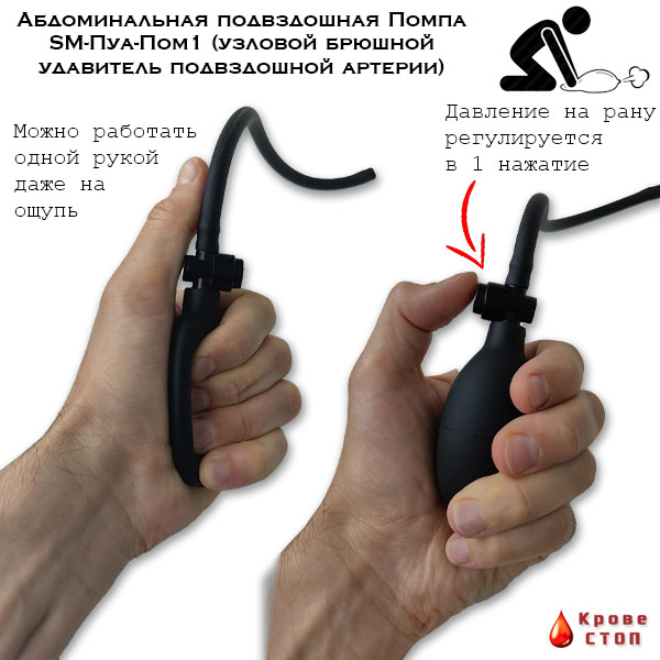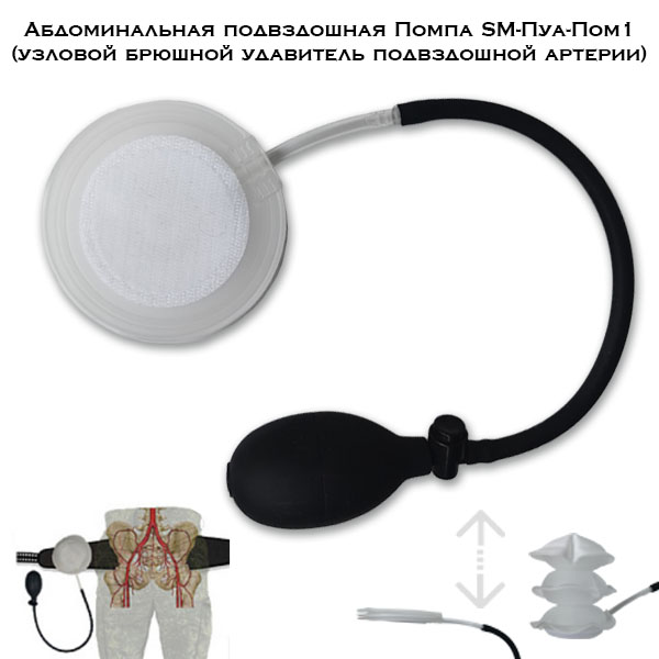 Абдоминальный подвздошный Пояс турникет SM-Пуа-Пояс1 выполнен в форме пояса с регулируемым охватом и надувной груши с манжетой специального диаметра и формы, подобранного для создания узкофокусного (точечного) давления в подвздошную область для перекрытия кровотока к дистальной части конечностей.