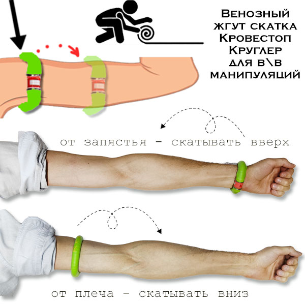 Также, с помощью скатывающихся жгутов можно работать с пациентами, которые пережили массивную кровопотерю и вены у которых немного "схлопнулись" и трудно находятся: достаточно одеть два круглера на конечности, один сверху у плеча, а другой снизу у запястья, после чего скатить их навстречу друг дружке, в сторону локтя, что приведет к сбору крови в одном локализованном месте и позволит легче обнаружить вену предплечья для установки в\в канюли.